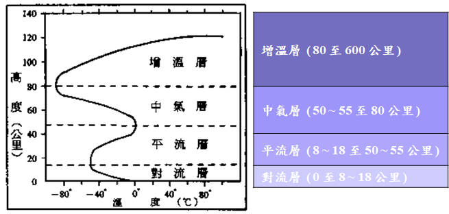 地球表面大氣層依溫度的垂直分布與變化來劃分,可分為「對流層」、「平流層」、「中氣層」與「增溫層」。