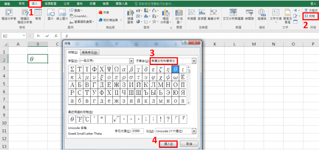 點選「插入」-「符號」,選擇子集合「希臘文和科普特文」,即可看到「θ」符號,選取後再點選「插入」。