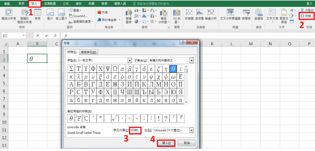 點選「插入」-「符號」,字元代碼輸入「03B8」即為「θ」符號,再點選「插入」。