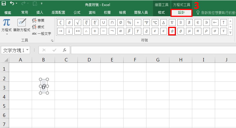 點選「插入」-「方程式」,接著於「方程式工具」-「設計」,即可看到「θ」符號,點選即插入。