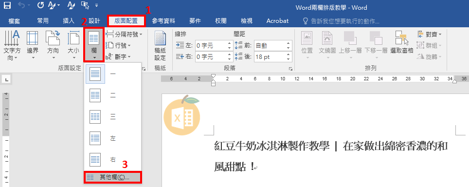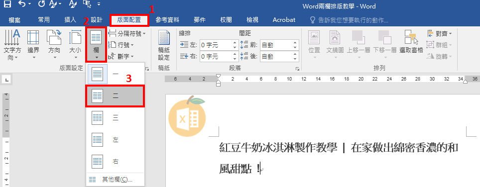 在「版面配置」中找到「欄」(Columns)按鈕,點開下拉選單。