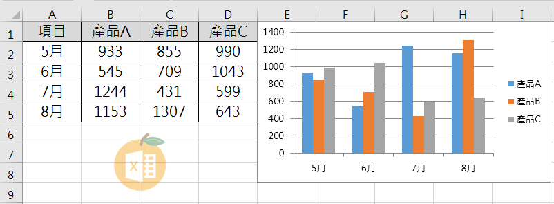 ‘設定圖表的寬度,使其與「E1:I8」儲存格的寬度相同。