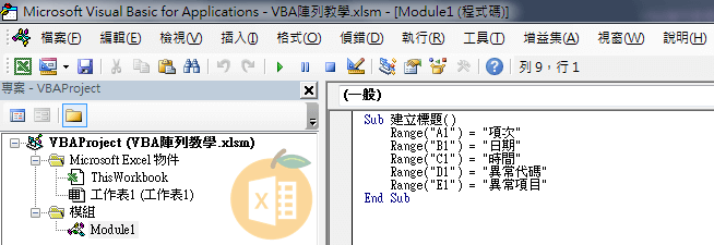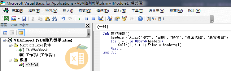以下是一個實用的 VBA 範例:在 Excel 的第一列自動輸入標題欄。