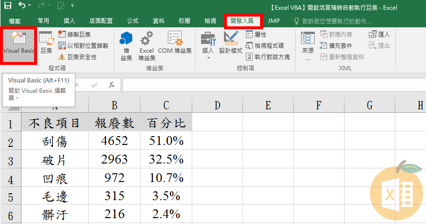 點選「開發人員」-「Visual Basic」或按下「Alt」+「F11」快捷鍵。