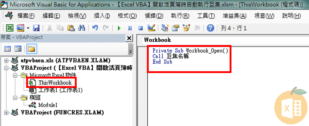 ※一般是在「模組」寫入VB,而「開啟時自動執行」則是寫到「Microsoft Excel 物件」-「ThisWorkbook」,並輸入以下指令