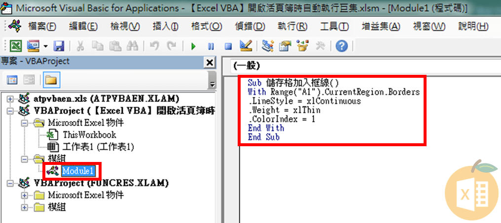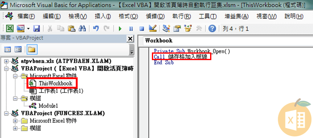 則於「ThisWorkbook」,Call後填入巨集名稱「儲存格加入框線」