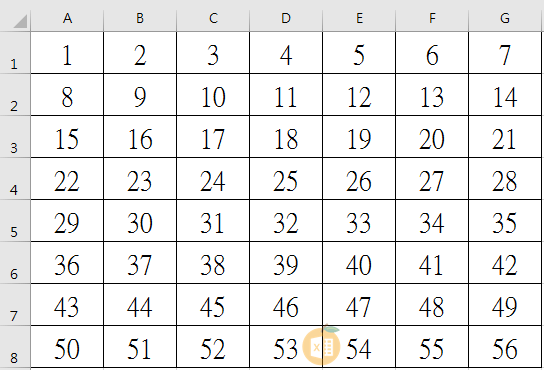首先向右拖曳與向下拖曳排序,列出數字表(1~56)。