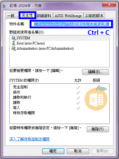 選取「安全性」可看到「物件名稱」則為檔案路徑,框選後按下「Ctrl」+「C」複製。