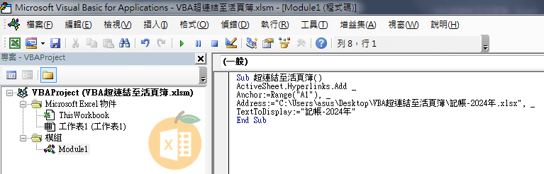 Address:=”C:\Users\asus\Desktop\VBA超連結至活頁簿\記帳-2024年.xlsx”, _