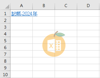 執行後則於「A1」儲存格建立「超連結」,並連結至「記帳-2024年」活頁簿,超連結文字顯示「記帳-2024年」。