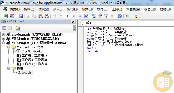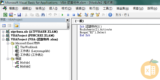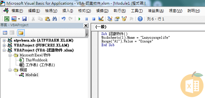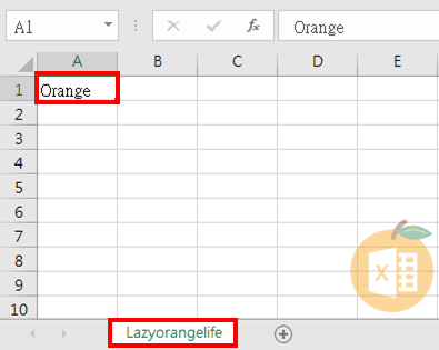 執行後會看到第一個工作表名稱變更為「Lazyorangelife」,A1儲存格的值變更為「Orange」。