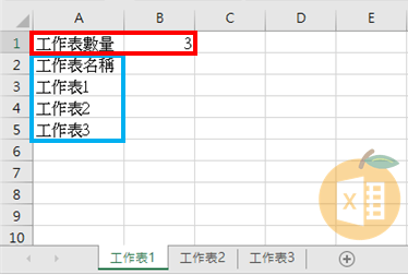 執行後即可看到「A1儲存格」代入「工作表數量」;「B2儲存格」則顯示工作表的數量「3」,而「A2儲存格」向下依序顯示出各「工作表名稱」。