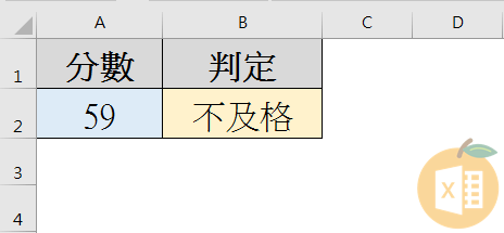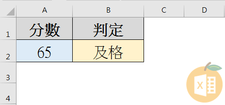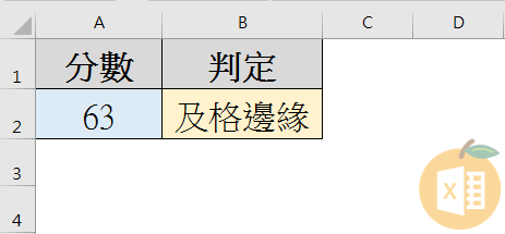 執行後則快速判定A2儲存格,若分數「<60」,B2儲存格顯示「不及格」;若分數「>=60且<65」,B2儲存格顯示「及格邊緣」;若分數「>=65」,B2儲存格顯示「及格」。