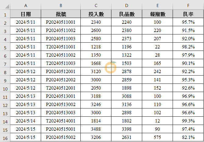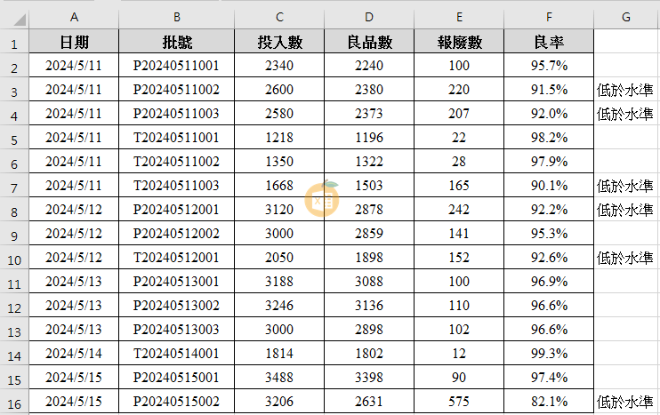 執行後則快速判定良率儲存格(第6欄)的值,若小於95%則於第7欄儲存格顯示「低於水準」。