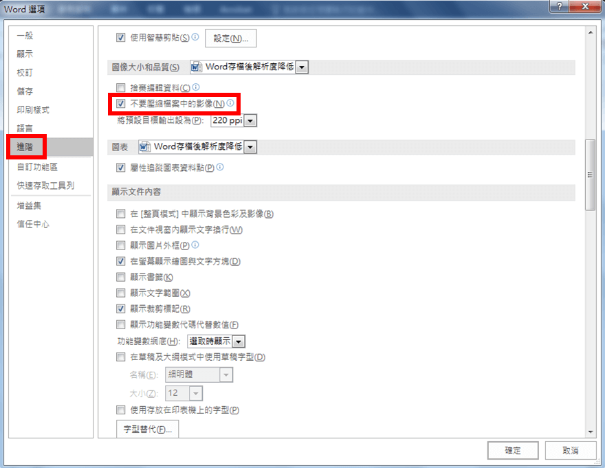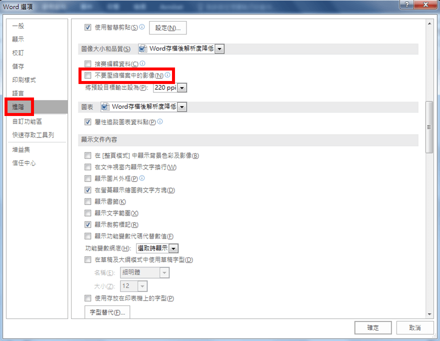 「進階」,找到「圖片大小和品質選項」裡的「不要壓縮檔案中的影像」。