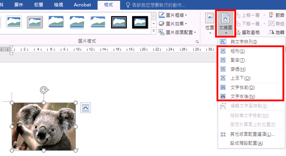 一般插入圖片,文繞圖會是「與文字排列」,而此設定則會選取不到任何物件,點選圖片-「文繞圖」,改成「矩形」、「緊密」、「穿透」、「上及下」、「文字在前」或是「文字在後」都可以。