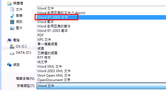 Word 2007以上的版本存檔的副檔名為「.docx」,需要將其變更為Word 97-2003,也就是副檔名為「.doc」。