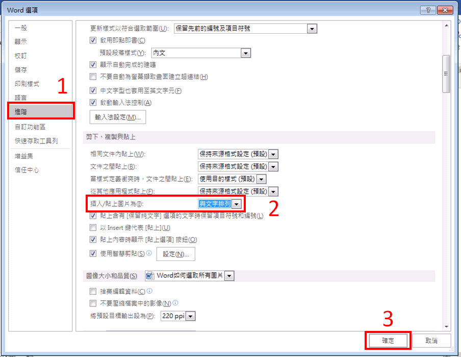 是的,所以需要學會更改文繞圖的預設配置,點選「檔案」-「進階」-「剪下、複製與貼上」,插入/貼上圖片為(I),將「與文字排列」更改為其他類型設定,這樣插入的圖片就不用一張一張更改文繞圖設定啦!