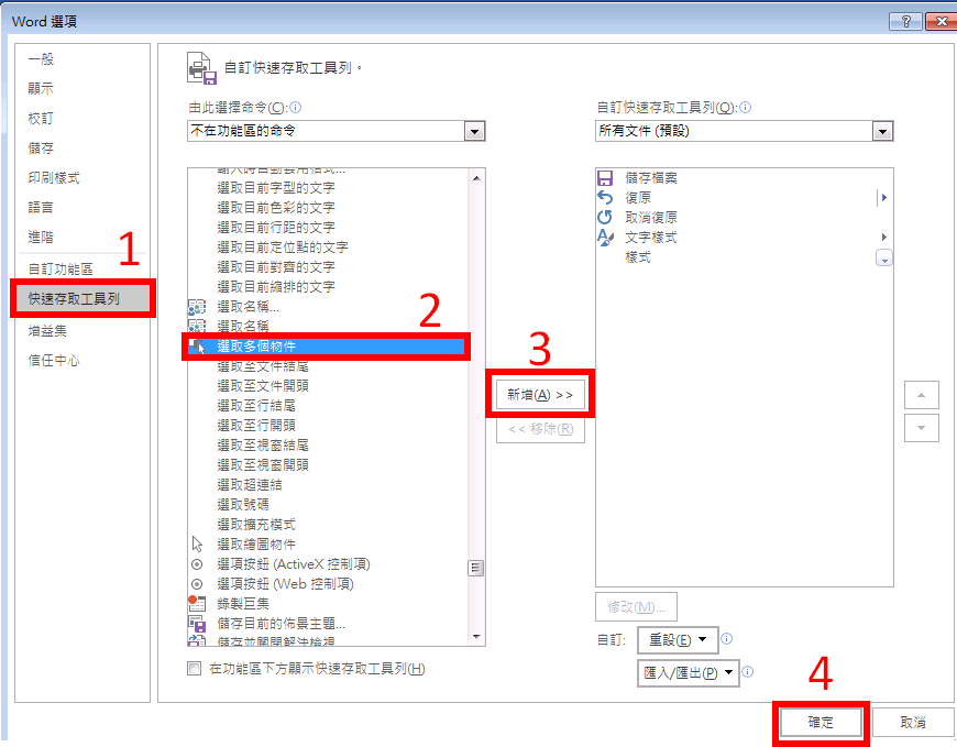 再從裡面找到個功能「選取多個物件」,點選「新增」,按下「確定」。