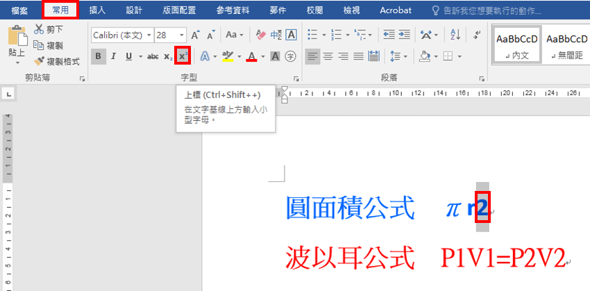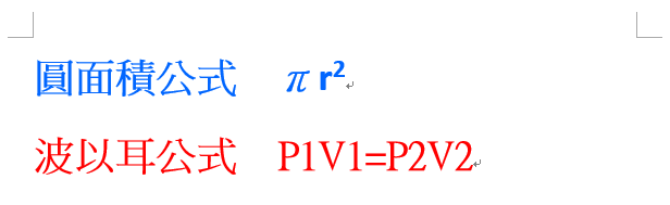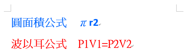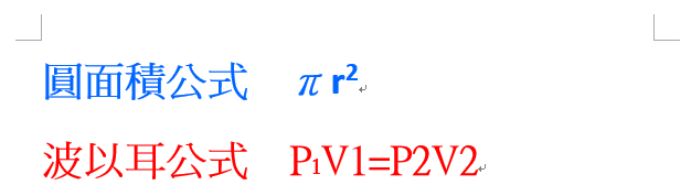 如下圖,要怎麼將圓面積公式πr2用成上標,波以耳公式P1V1=P2V2用成下標呢?