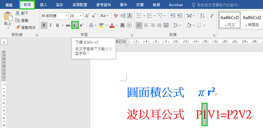 選取要下標的文字/數字後,點選功能區「常用」,即可看到「字型下標」。
